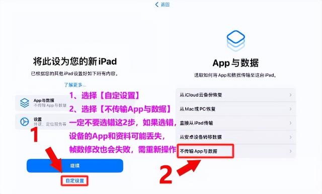 (注:一定要选择不传输App与数据,可以看下图,如果选错,设备上的APP会全部重新下载,也需要重新操作修改)