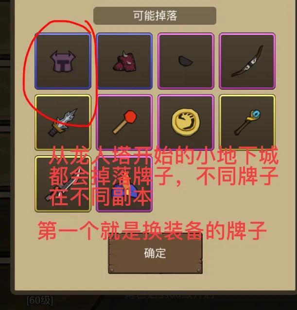 装备获取方面普通地图会掉落白蓝紫散件,具体哪个图掉可以点开地图掉落信息查看,不过野怪掉的基本没用,主要装备来源还是通过副本,副本会掉落散件和低级套装,前期我们随便凑凑装备过度很快,以升级等级为主,等达到可以打龙人塔的时候,就可以掉落换高级装备的牌子了,掉落牌子的图上面已经给大家放了,可以对应所需看一下。