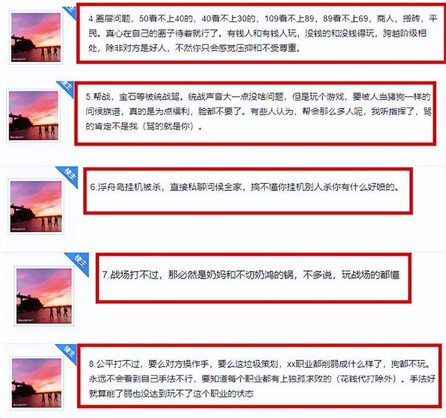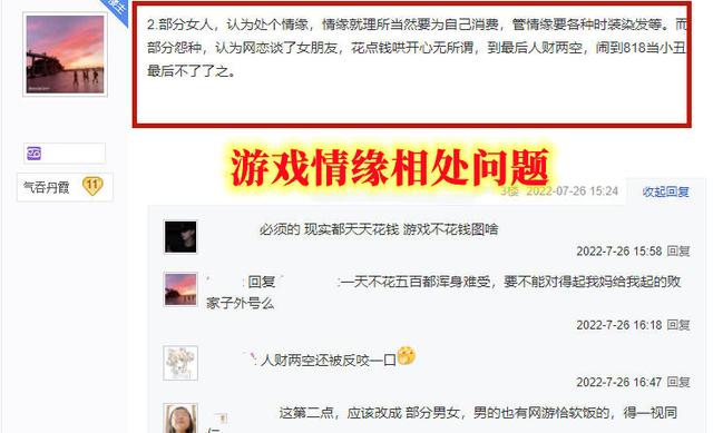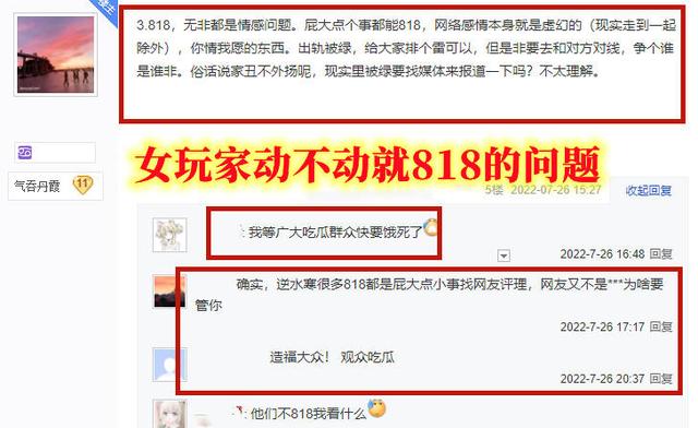 排在第二位和第三位的则全是和女玩家有关的游戏CP话题。这位硬核玩家认为,凡是在游戏中处情缘,由于送礼物问题,以及种种情感矛盾,最后闹上818的,全都是无理取闹!网络感情本就是虚幻的,有一方在虚拟感情中受到了伤害,就要把这件事情闹得人尽皆知,简直就是自爆卡车。