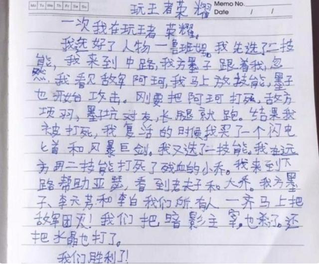 在小学生中,网络游戏是非常收欢迎的,尤其是王者荣耀,一度成为一个时代的象征,所以这位老师就让学生以《玩王者荣耀》为主题,写一篇命题作文,而这些学生就写了自己玩王者荣耀的过程,在这次玩游戏的过程中就用的是“鲁班”。